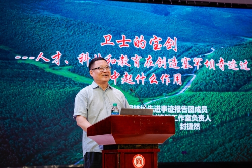 中宣部塞罕坝林场先进事迹报告团成员封捷然进行宣讲 宣讲由中宣部塞罕坝林场先进事迹报告团成员封捷然主讲,以“卫士的宝剑——人才、科技和教育在创造塞罕坝奇迹过程中起什么作用”为主题,讲述了塞罕坝三代人精神传承不息、艰苦创业奋斗,创造“荒原变林海”绿色奇迹的故事,为现场师生们生动阐释塞罕坝精神的时代价值。